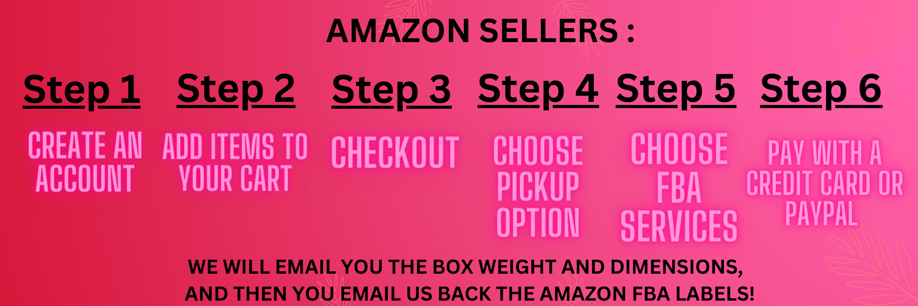 We specialize in sending products to Amazon FBA for you. You can create an account right on our website and start ordering. When you add items to your cart and checkout, use the PICK UP option - that will take the shipping costs off. Then checkout with a credit card or paypal. We will then then email you the weights and dimensions of the boxes, and you email us back the amazon FBA label and UPS label.